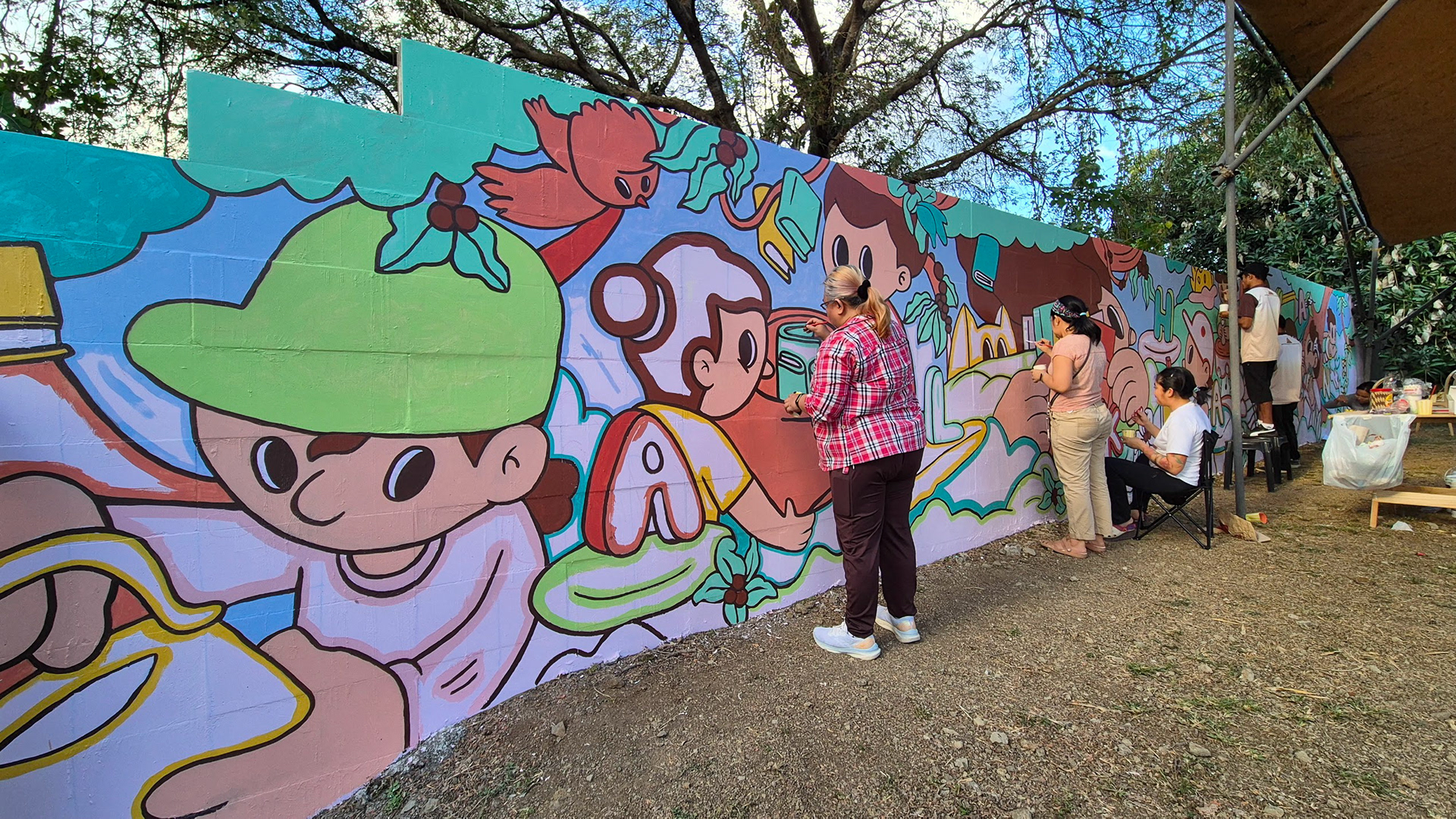 The mural, entitled "KaLIKHAsan," a combination of the Filipino words "kalikasan" (nature) and "likha" (to create) was designed by Leo Kempis Ang as an illustration of creativity, community, and care for the environment. "The mural presents a vibrant scene of people, plants, animals, and stories existing side by side," reads the artist statement. "Seen from a larger-than-life perspective, the figures engage in everyday acts of care—watering plants, harvesting, playing—celebrating the work of making by hand and the joy of sharing what we create. Scattered letters throughout the scene remind us that caring for the world is a shared responsibility."